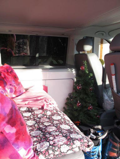 World Cup Ski season. Most races are in Europe. To get from race to race, she travels the autobahn in style...in a California Multivan. She recently posted these pix on FB, and I LOVE LOVE that she has an xmas tree in the van...don't you?
