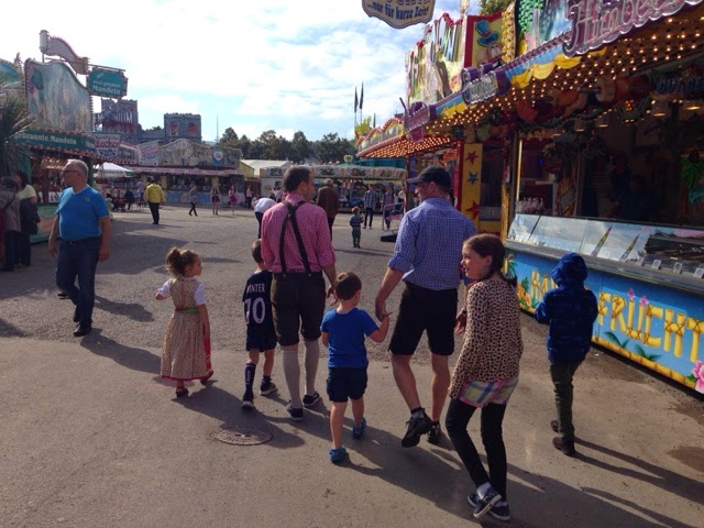 Once in the beer tent, which was one of about 5 huge beer tents, the 10 of us found the most family friendly seats we could, and settled in for some chicken, pretzels, beers, singing, spilling, and dancing on the tables.